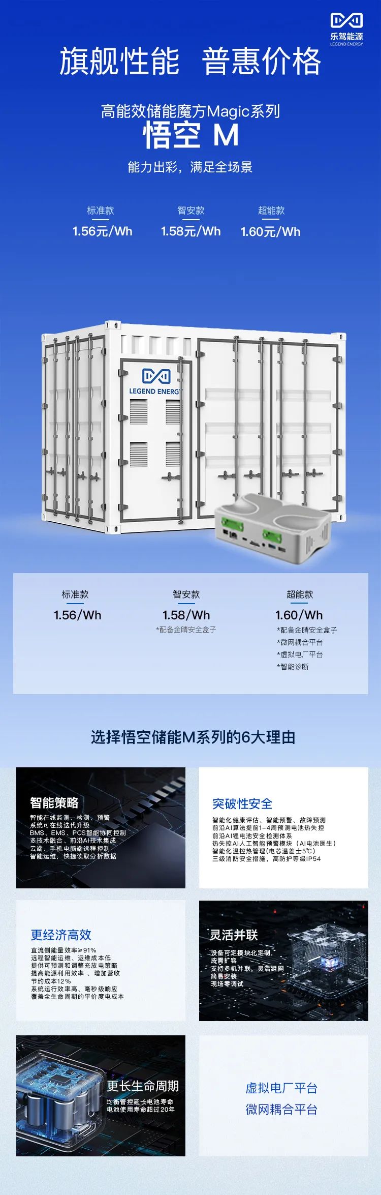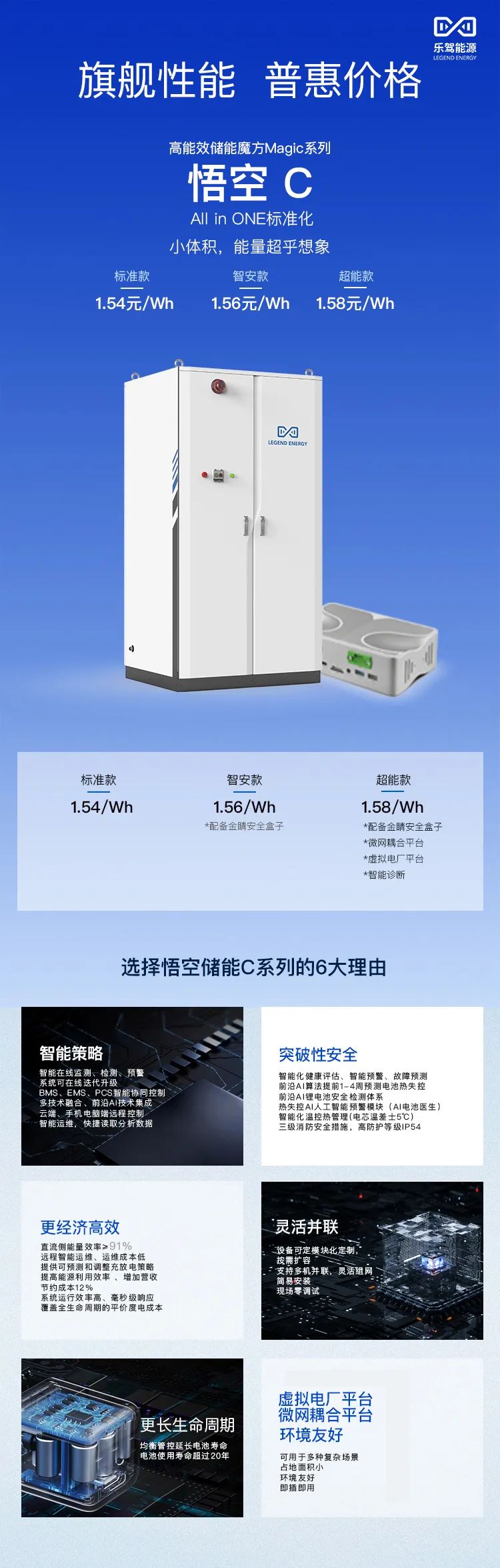 悟空C、悟空M系列超能版作为乐驾能源新一代旗舰储能产品,不仅追求更高效益,还要进一步智能化。全新发布的悟空C、悟空M系列超能版,悟空C超能款售价为1.58元/Wh,悟空M超能款售价为1.60元/Wh。配备了世界级领先的优势AI算法与电池管理算法融入标准化储能硬件产品中,实现月、周、日、时、分预测电池热失控,均衡管控延长电池寿命,节约成本12% ,97.37%准确率实测安全事故,以及成功突破能效比91.5%+,实现行业领先。