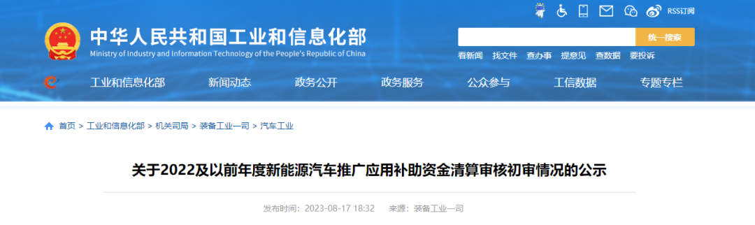 8月17日,工信部发布了关于2022及以前年度新能源汽车推广应用补助资金清算审核初审情况的公示。