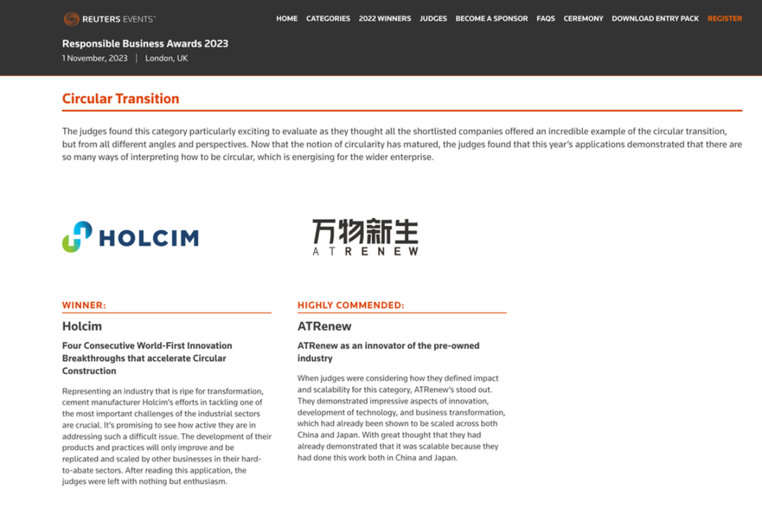 11 月 1 日,路透社(Reuters)公布了 2023 年“全球商业责任奖”(Responsible Business Awards 2023)评选结果。万物新生(爱回收)在“循环过渡奖”(Circular Transition Award)评选中获得评委会高度赞扬(highly commended)。
